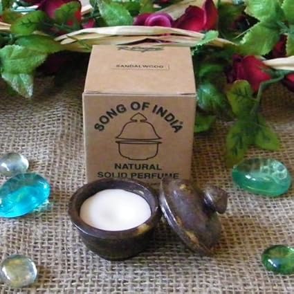 Baume de parfum indien au santal Contient des huiles essentielles naturelles, de l'extrait d'Aloé Vera, de Thé Vert , de germe de Blé, de la cire d'abeille et de la cire végétale. Naturel, sans alcool et non testé sur les animaux. Fait en Inde